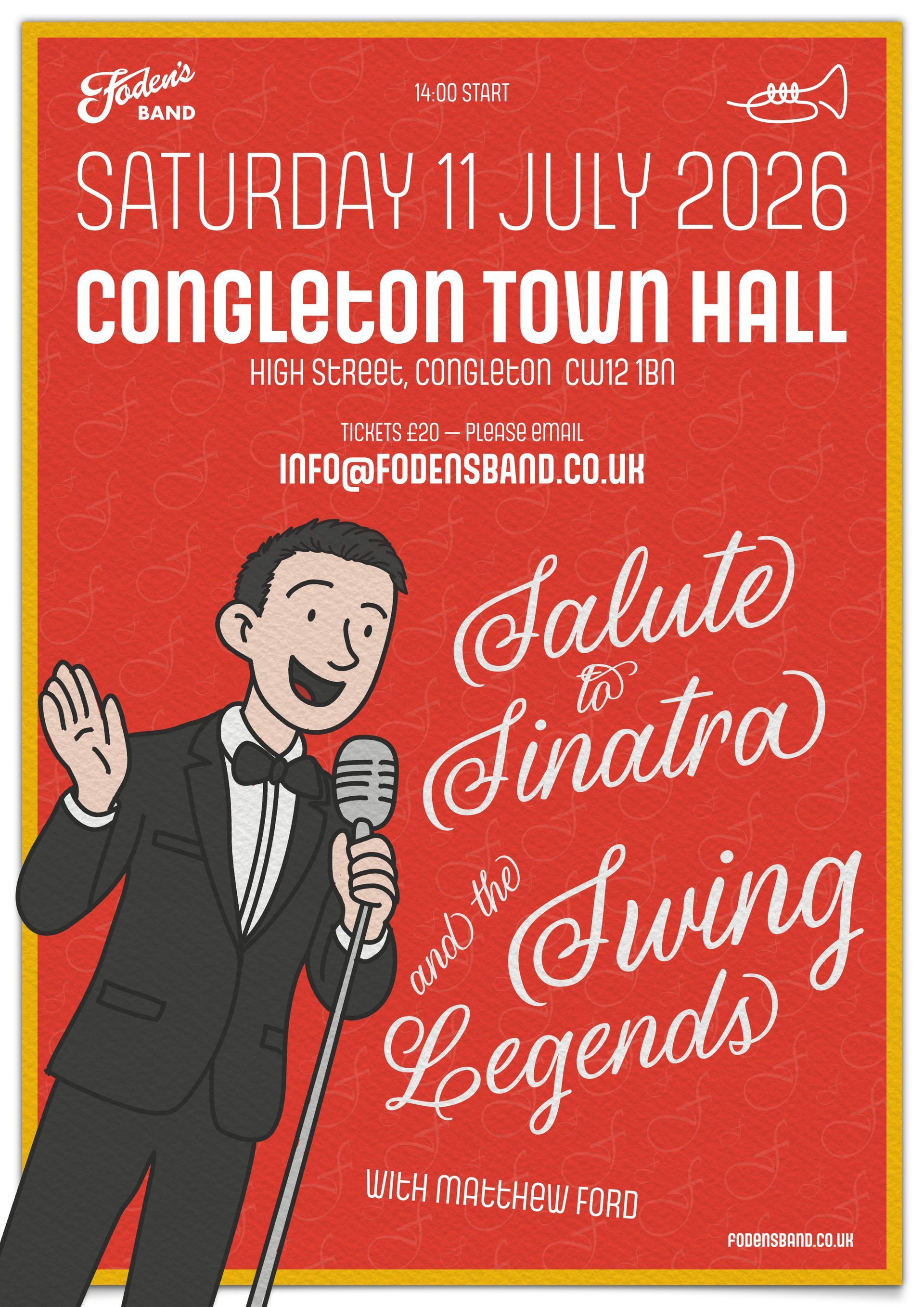 Join Foden’s Band and special guest Matthew Ford for an unforgettable afternoon of music… Widely regarded as one of the UK’s finest big band vocalists, Matthew Ford returns to Congleton alongside the multi-award-winning Foden’s Band. Expect timeless classics from Frank Sinatra and the golden age of swing. With accolades including ‘Best UK Male Big Band Vocalist’ and performances with the BBC Big Band, John Wilson Orchestra and at the BBC Proms, Matthew brings world-class entertainment to the stage. Foden’s will provide the perfect backdrop for a spectacular celebration of swing music. Congleton Town Hall - Saturday 11th July - 2:00pm Tickets: £20 via: info@fodensband.co.uk Don’t miss what promises to be a fantastic afternoon of iconic swing hits performed by one of the UK’s leading brass bands and one of its finest vocalists!
